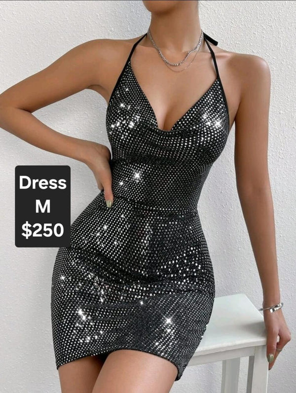 Experience luxury and glamour in our Allurite Draped Collar Backless Metallic Rhinestone Dress. With a sleek and alluring draped collar, this dress exudes elegance. The backless design adds a touch of sensuality, while the metallic rhinestones elevate the sophistication. Shine like a star in this statement piece.